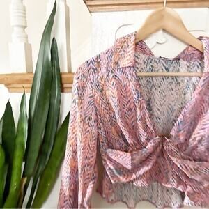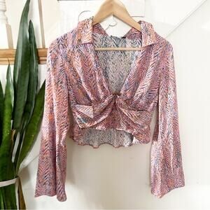 Zara Printed Long Sleeve Collared Neckline Wooden Buckle Crop Blouse Sz S