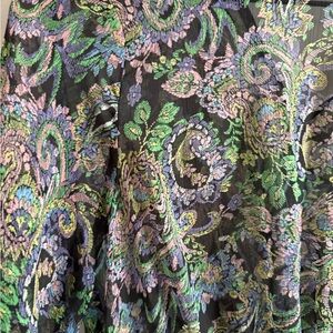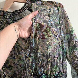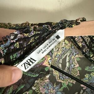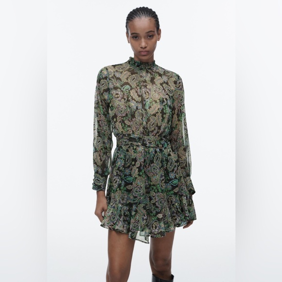 This elegant Zara dress features a ruffled and smocked design in a beautiful green and black color palette. With its long bishop sleeves and flattering V-neckline, it's perfect for a wedding guest or cocktail occasion. The lightweight fabric and feminine silhouette make it a stylish choice for a night out. The top is sheer, below the waistline is lined!