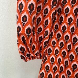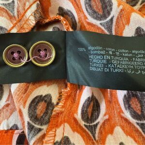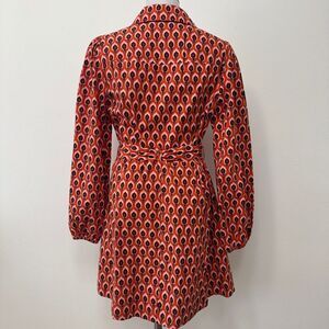 Mini dress with lapel collar and long sleeves with elastic cuffs. Self-belt with metal buckle. Front button closure. Orange