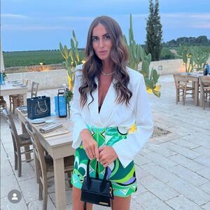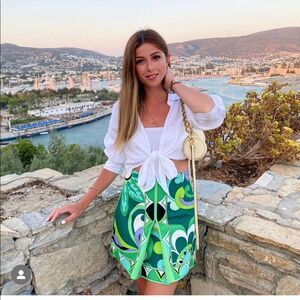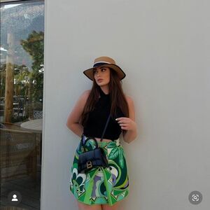 High-waisted printed mini skirt. Front fabric overlay with front slit. Side hidden in-seam zip closure