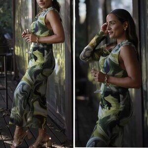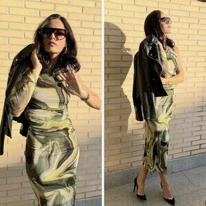 Keywords: Zara tulle skirt, green mesh midi skirt, tie-dye print skirt, sheer overlay skirt, elegant pencil silhouette, brunch outfit, date-night style, feminine fashion, coastal chic look, European summer outfit, quiet luxury