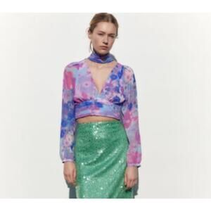 Zara Purple & Blue Floral Long Sleeve Cropped V-neck Choker Collar Blouse