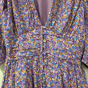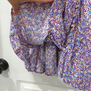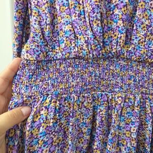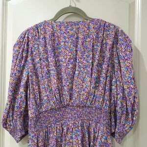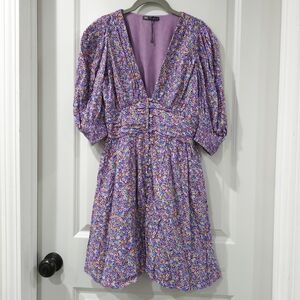 Zara Purple Blue Yellow Floral Puff Smocked Sleeve Sundress Mini, Deep Vneck, S