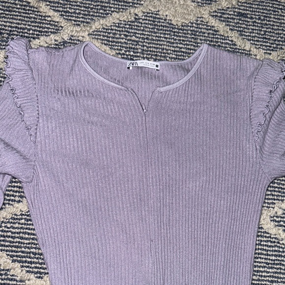 This elegant purple blouse from Zara features a ribbed texture and charming ruffled details, offering a sophisticated touch to your ensemble. The blouse is designed with a comfortable fit, making it a versatile addition to your wardrobe.