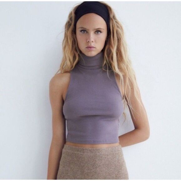 Zara Purple Ribbed Turtleneck Cropped Tank Top