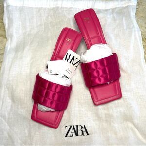 Heeled sandals. Quilted wide front strap in satin effect with topstitching. Squared heel and toe.