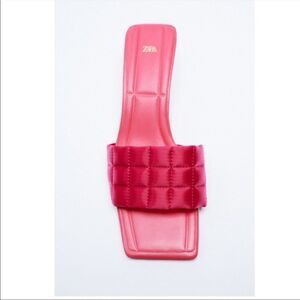 Heeled sandals. Quilted wide front strap in satin effect with topstitching. Squared heel and toe.