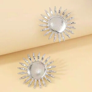 These **sunburst earrings** are crafted with a bold, modern aesthetic, featuring a prominent circular centerpiece with a reflective, polished surface. The **center disc** is slightly convex, adding a three-dimensional quality to the design. Surrounding the disc are **12 stylized rays** that extend outward, each with a jagged, irregular shape. The rays are slightly bent and tapered, mimicking the organic movement of sunlight.