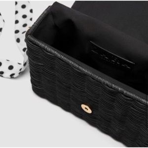 Zara Raffia Bag with a bow detail on the side. Metal chain shoulder strap. Magnetic closure.