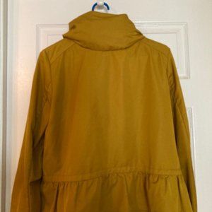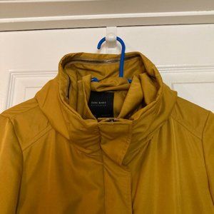PRE-OWNED. Gently used. Zara Mustard Hooded Rain Jacket. Jacket can be zipped and tucked away. Frilled bottom. Women's size Small