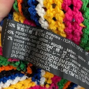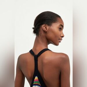 Adorable, fun racerback knit tank top from Zara in a vibrant pattern! It's a crochet 70s style and perfect for warm weather. In excellent preowned condition; no visible flaws. Size Small.