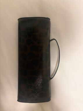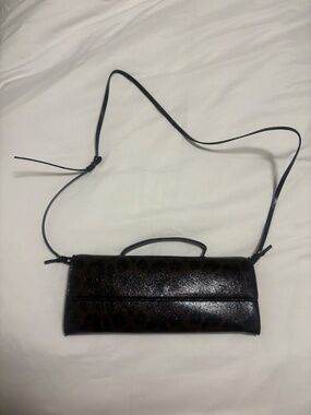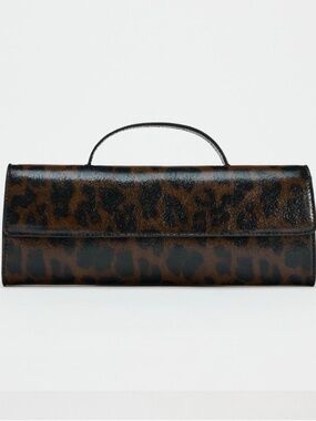 Leopard print long handbag with handle & crossbody strap. Interior card pockets. Magnetic button closure.
