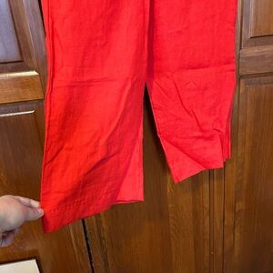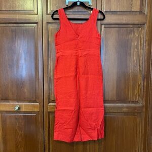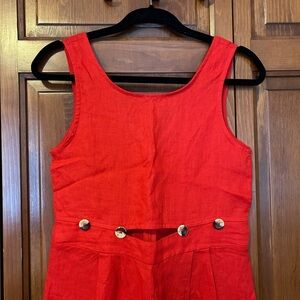 Like new 100% linen jumpsuit from Zara in a size 13-14. This jumpsuit is sleeveless and a vibrant red color. It has a small cutout on the front with some button accents. No stains or flaws!