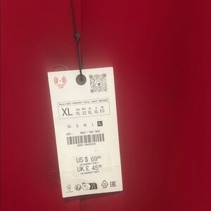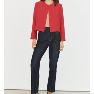 This striking red blazer from Zara features a minimalist collarless design, offering a clean and sophisticated silhouette. Crafted from a structured fabric, it maintains its shape beautifully, making it a standout piece in any wardrobe. Ideal for adding a bold touch to your ensemble, this blazer is perfect for both formal and casual occasional. Split at the sleeves.