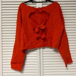 Super soft and comfortable red sweater. Rounded crew neckline and bow tie in the back which leaves it more of an open back -- very cute detail.