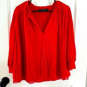 Very lightweight blouse that has a top bottom so the neck can be open or closed. Sleeves are 3/4 length.