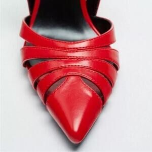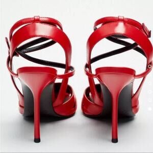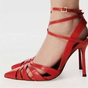 Zara Red Faux Leather Caged Pointed Toe Ankle Strap Heels Size 39=8 NWT