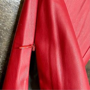 Bold and statement-making, these Zara high-waisted faux leather pants in vibrant red are a must-have for elevating your wardrobe. Made with a sleek, leather-look finish, these pants feature a matching wide belt with an oversized circular buckle, side zipper closure, and a tapered leg silhouette. Perfect for pairing with heels or boots for an edgy-chic ensemble.