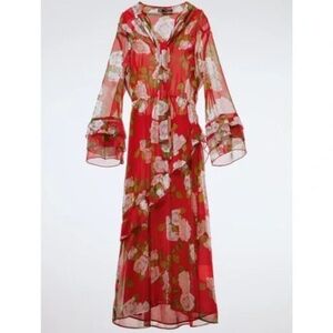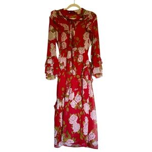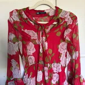 Zara Red Floral Print Long Sleeve Midi Dress with Ruffles Size Small
