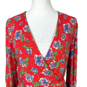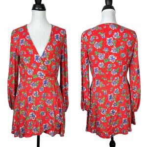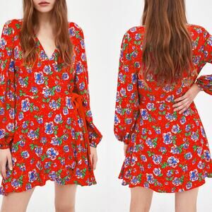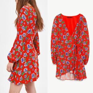 Zara | Red Floral Print Long Sleeve V-neck Crossover Mini Romper Dress