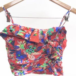 Sleeveless crop with thin straps. Floral print with ruffle trim. Ruched, fitted bodice. Vibrant multicolor pattern. Dress up with jeans or a skirt.