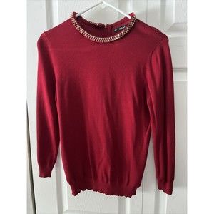 Zara Red Knit, Quarter-zip Long Sleeve Top With Gold Chain Neckline Detail (M)