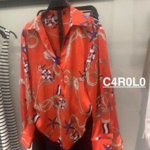 Vibrant red blouse with nautical print. Features long sleeves and button-up front. Perfect for a stylish look.