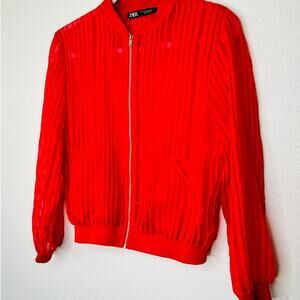 Zara Red Organza Sheer Striped Bomber Jacket Front Zip