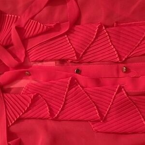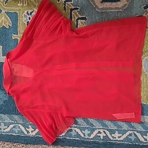 Chic red blouse with ruffled details. Short sleeves. Button-up front. Perfect for any occasion.