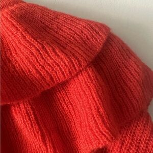 Stylish red sweater with ruffled neckline. Perfect for a chic look.