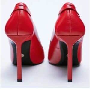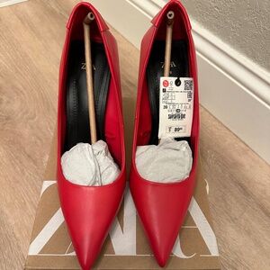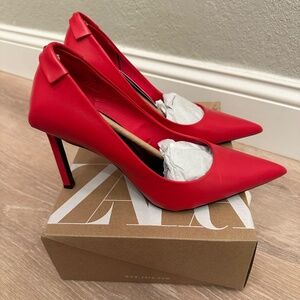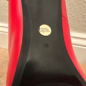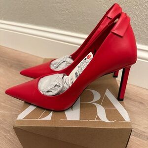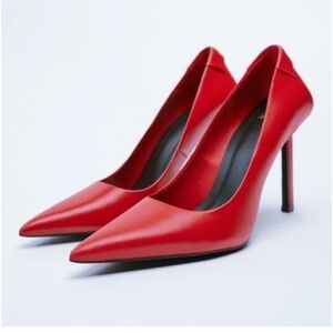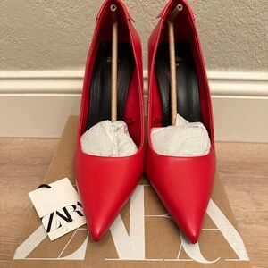 Zara Red Stiletto pointed toe high heels leather pumps shoes with squared back, size 8 - Euro 39. Heels - approx 3.5 in.