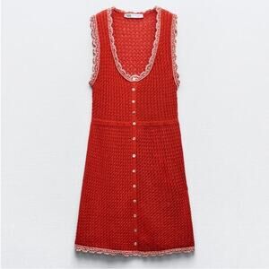 Zara Red White Pointelle Knit Scallop Hem Mini Dress Small Blogger Favorite