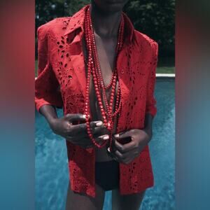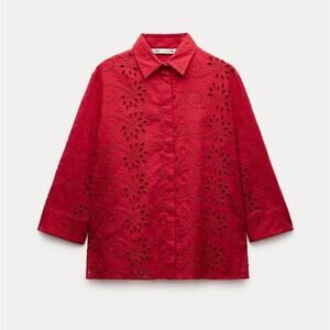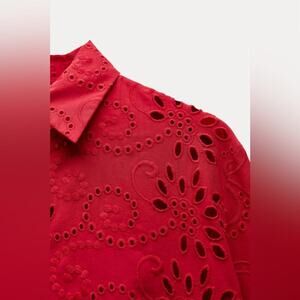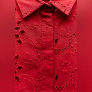 Zara Red ZW COLLECTION EMBROIDERED POPLIN SHIRT