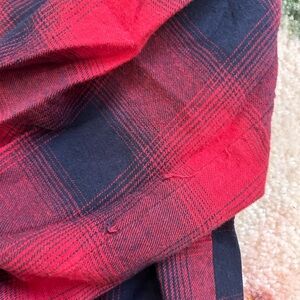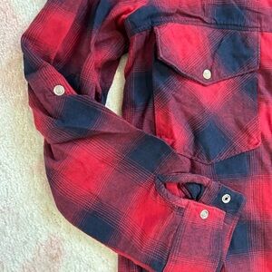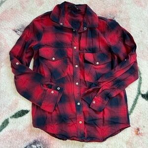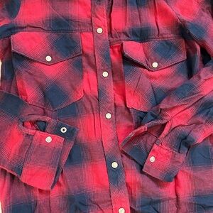 Zara Red and Navy Plaid Button-Up Shirt. Stylish plaid shirt with button-up front. Features two chest pockets. Perfect for casual wear. Pearl like buttons. Can be worn with sleeves down or folded. Has shoulder details. Gently used. Has some slight fraying on elbow areas. Size small. Great with jeans!