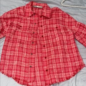 Chic Zara shirt with red and white plaid pattern. Features button-up front and classic collar.