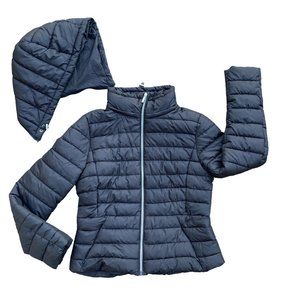 Zara Women’s Neutral Black Puffer Jacket Removable Hood Silver Hardware Winter Fall Coat