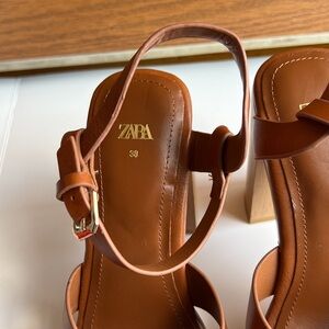 Zara Retro Leather Platform Tan / Brown Block Heels Strappy Sandals