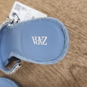 Denim fabric high heel sandals. Thin strap at front with rhinestone details. Squared toe.