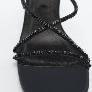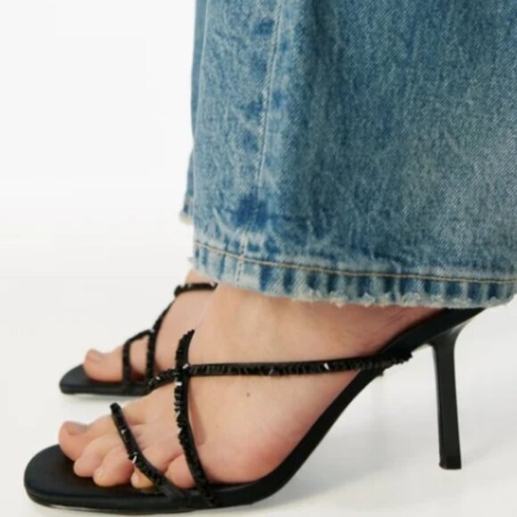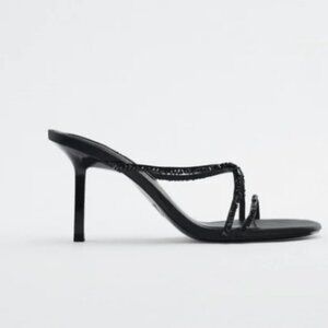 Heeled sandals with crossed straps with rhinestones. Squared toes