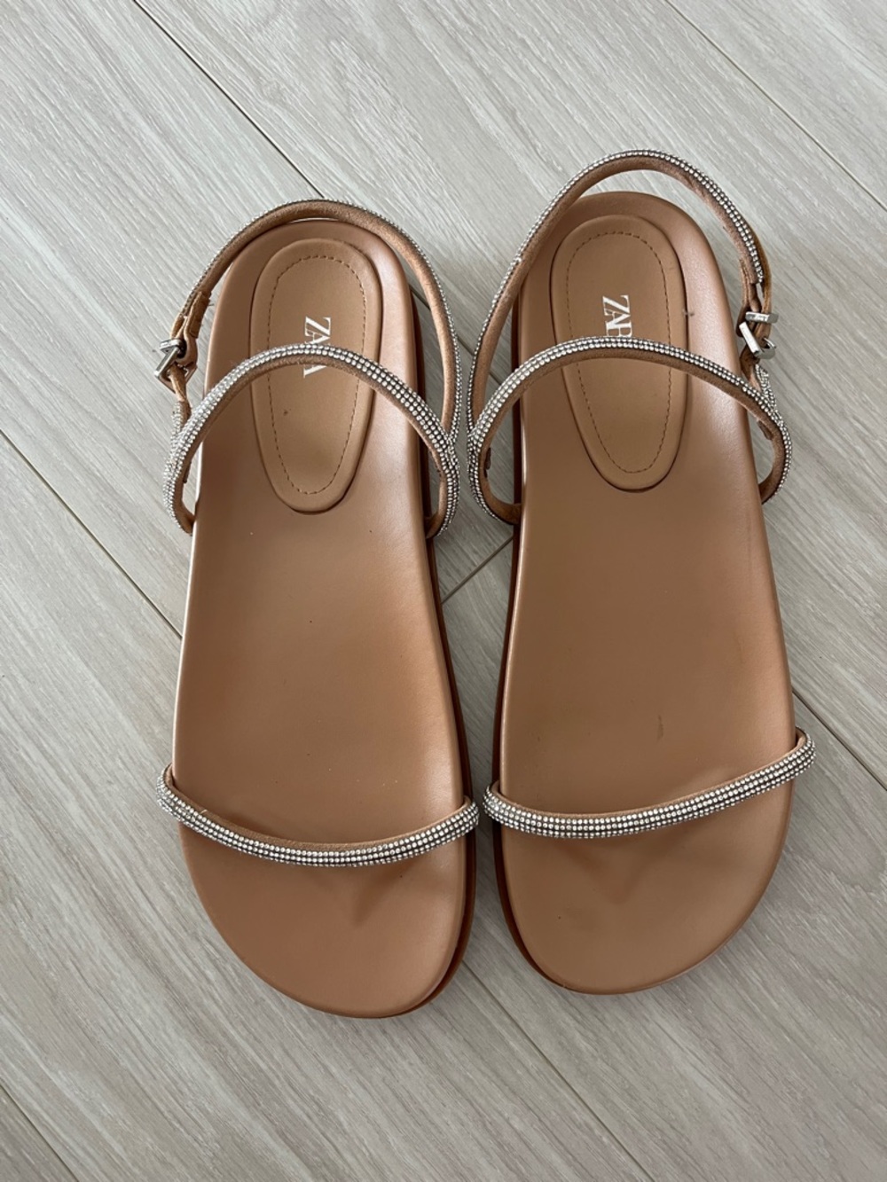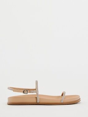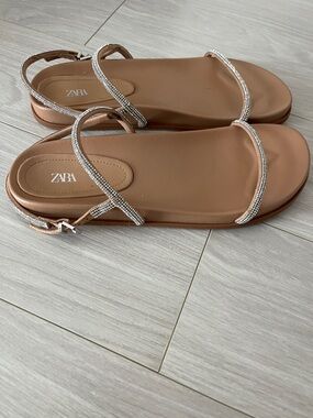 Zara sandals with slim rhinestone-accented straps. Smooth cognac footbed. Secure ankle buckle for a snug fit.