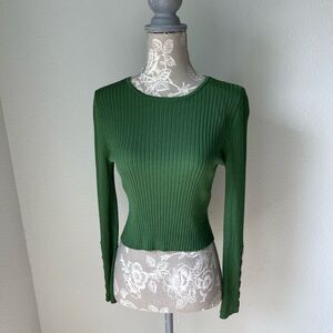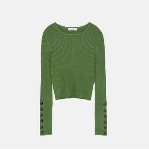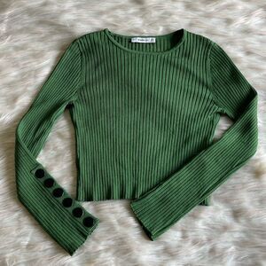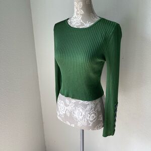 Ribbed Cropped Sweater by Zara in Green. Ribbed knit. Round neck and long sleeves with metallic buttons at cuffs. Gently worn with two small marks on sleeves. Measurements in photos.