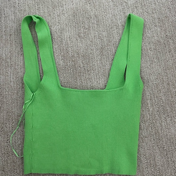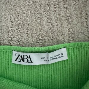 This vibrant green tank top from Zara features a fitted crop style with a square neckline and wide shoulder straps. Made from a solid-colored fabric, it offers a sleek and modern look perfect for casual outings or layering.