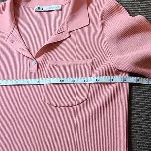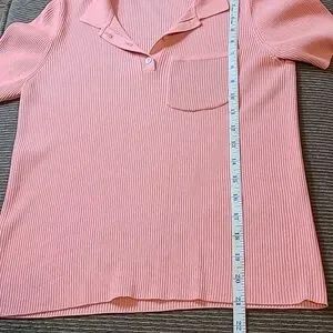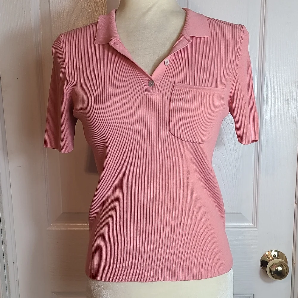 Short Sleeve, Collared Neckline, 3 Button Closure at Bodice, Snug Fitting, Ribbed, Stretchy, Dusty Pink in Color, Size Medium.