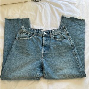 Classic straight leg jeans. Frayed hem detail. Perfect for casual wear.