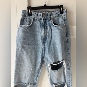 Large knee holes and hole at thigh. Shredded/ frayed waistband and pocket edges.