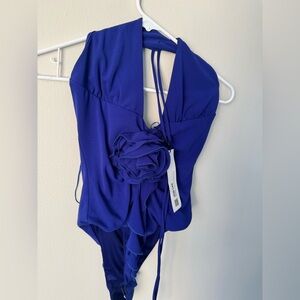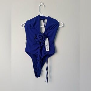 Bodysuit With Tied Halter Neck. Self-Raised Flower Detail. Bottom Snap Button Closure And Back Hidden In-Seam Zip Closure. 100% Polyester. Brand New Size: S (Small)