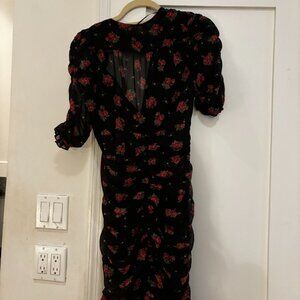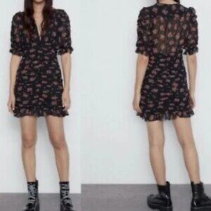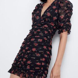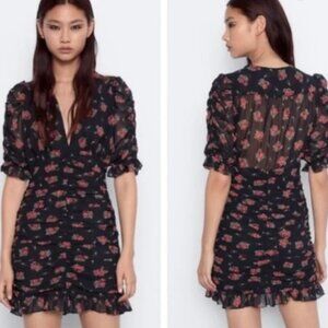 Zara Rose Print Ruched and Ruffled Mini Dress Size Extra Smaller