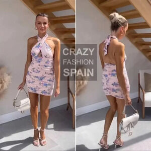 Zara Ruched Floral Halter Mini Dress Pink Purple NWOT Size Medium