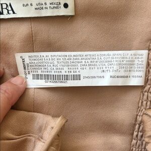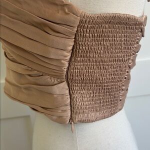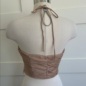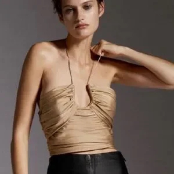 Zara satin effect halter top with ruched design. Nude/tan/gold color. Excellent condition. Never worn. Happy to provide any measurements.
