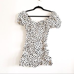 Strike a retro mood with this adorable, ruched mini dress. Polka dots and puffed shoulder give playful update. Very stretchy, forgiving material and back zipper closure. Strappy heels and a chain-link shoulder bag will take your look from day to date night! In excellent condition.